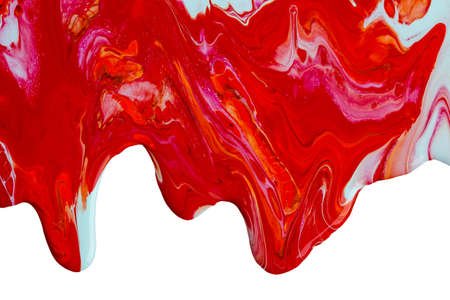 Bright red liquid drops of paint color flow down on isolated white background. Abstract scarlet backdrop with fluid drip pattern. Acrylic painting with copy space.