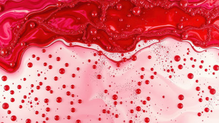 Vibrant abstract red and pink liquid texture with bubbles and waves in a fluid design
