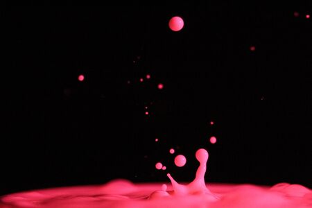 A red drop drips into the water and creates splashes of different shapes, due to the splashes waves are created on the water, the concept of a liquid splash, the substance is painted pink