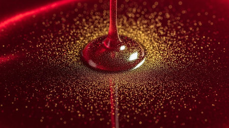 This macro showcases a deep red, viscous liquid with scattered gold glitter. A single droplet is captured mid-fall, creating a ripple effect in the pool below. The pool itself is a rich, dark red, illuminated to highlight the embedded gold particles that sparkle and shimmer. The surface of the liquid is glossy and reflects light, adding to its feel. The dark background creates a dramatic contrast, focusing all attention on the fluid dynamics and the interplay of red and gold. The evokes a...