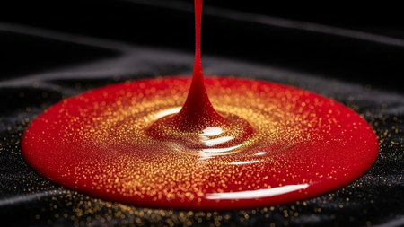 A close-up macro shot captures a stream of vibrant red liquid with suspended gold glitter pouring onto a dark, textured surface. The liquid forms a circular pool, with the gold particles scattered throughout, creating a sparkling and effect. The contrast between the bright red and gold against the deep black background is striking. The highlights the fluid dynamics and the shimmering of the glitter.