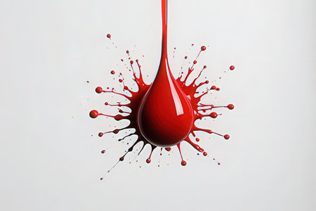 A single drop of blood impacts a pool of liquid, creating a dramatic splash with vibrant red droplets suspended in mid-air.