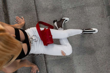 Young woman with red handbag in white jeans and fashionable leather shoes sits on the steps in the city, top view