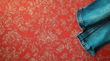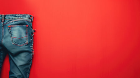 a pair of blue jeans hanging on a vibrant red background, showcasing detailed attention to costume and fashion. the pastel color scheme and bold chromaticity create a visually striking image. the combination of red and gray adds depth to the composition. captured with kodak portra, the photo appears smooth and shiny, making it truly eye-catching. ai generated