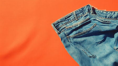 A close-up view of stylish denim jeans placed on a vibrant orange background. Perfect for fashion and lifestyle photography, showcasing modern styles.
