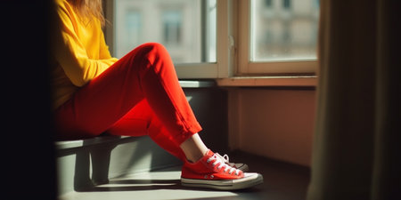 Female in red pants and yellow shoes sitting near window.