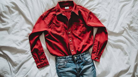 A casual red shirt paired with jeans, perfect for a relaxed yet stylish look, laid out neatly on a bed
