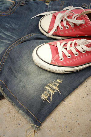 Red shoes with jeans on cement background.