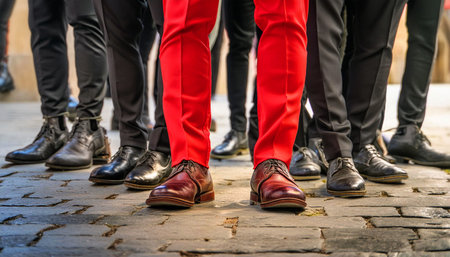 A single man with red shoes and trousers among a group of men with black shoes and trousers. Standing out from the crowd, thinking outside the box, leadership and individuality concept. Generative Ai.
