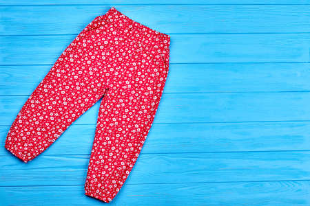 Fashionable summer baby girl pants. Vertical image of kids girl red patterned trousers lying on blue wooden background.