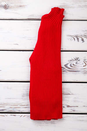 Folded red woolen sweater. Vertically folded warm pullover in bright background.