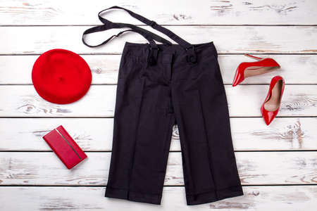 Black trousers with suspenders and red accessories. White wooden background top view.