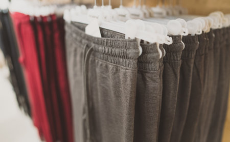 Rack with sweatpants in clothing store.