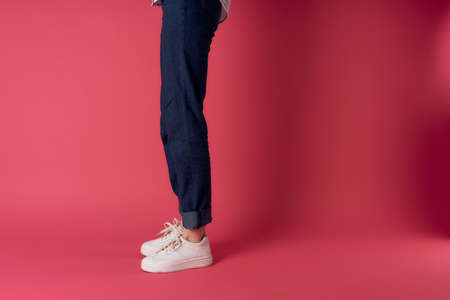 Womens feet white sneakers fashion street style pink background