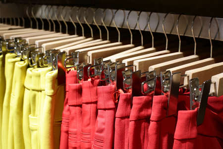 Colorful pants hanging in a closet. Clothes hanging on a hanger.