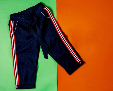 Infant girl casual summer trousers. Top view of colorful summer pants for baby girl and copy space. Trendy summer apparel for girl kids.