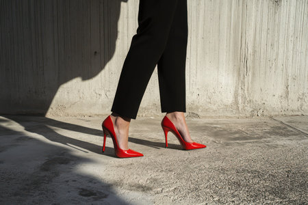 Fashion-forward composition showing woman's red heels and sleek trousers against an industrial concrete floor, emphasizing chic urban style.