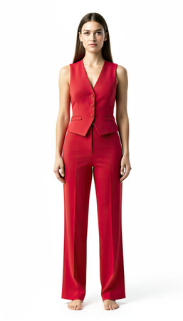 A stylish woman in a vibrant red vest and matching pantsuit strikes a confident pose against a clean white background.