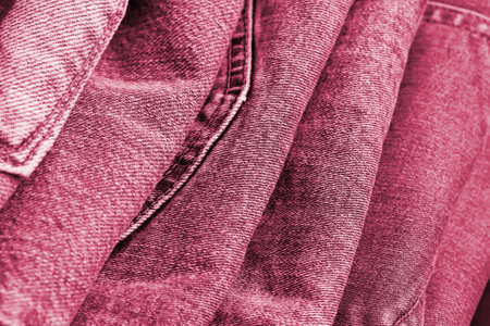 Lots of jeans pants in a stack. Denim background. Image toned in Viva Magenta, color of the 2023 year.
