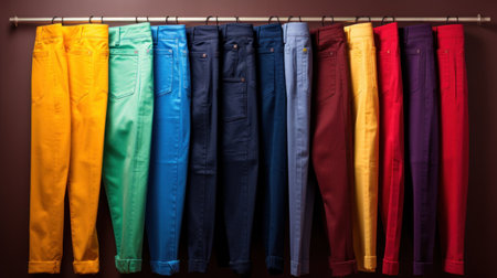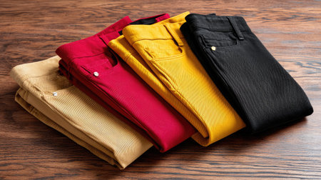 A stylish display of assorted folded trousers in vibrant colors, showcasing modern fashion trends. Perfect for casual wear and versatile outfit options.