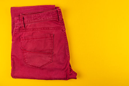 Folded red jeans sit neatly against a vibrant yellow background, creating a striking visual contrast that highlights the colors and texture of the fabric.