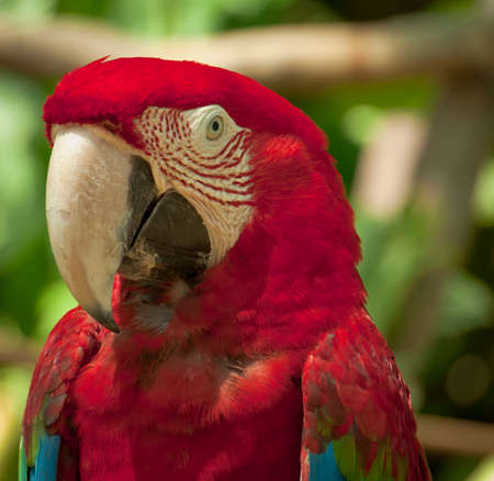 Portrait of a red parrot sitting on a branch