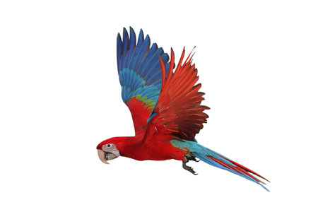 Colorful flying Green Wing Macaw parrot isolated on white background with clipping path.