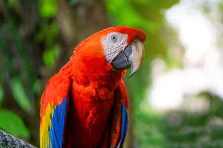 Red scarlet macaw on branch, colorful parrot bird. Wild life and animals.