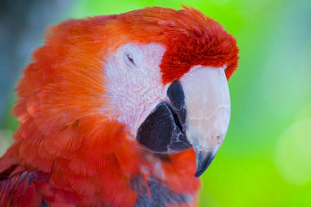 Close up portrait of macaw red head Ara with green background.