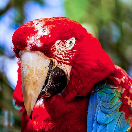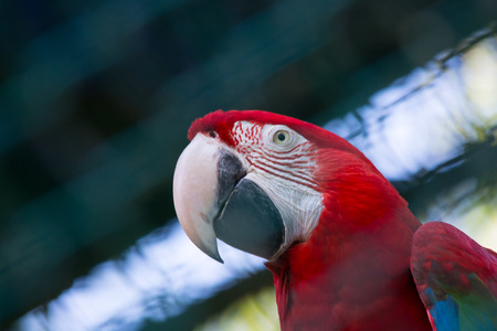 Closeup of head portrait of Red Macaw or Ara cockatoos parrot in zoo