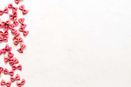 Multicolored pasta scattered on a white background. Top view. Copy, empty space for text.