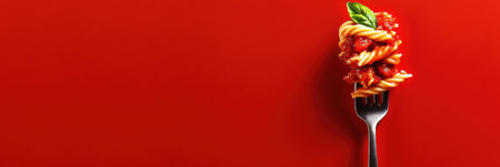 A serving of flavorful Italian pasta coated in tomato sauce is elegantly twirled on a fork, garnished with fresh basil leaves.