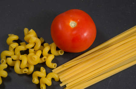one ripe red tomato in the middle of a bouquet of raw spaghetti top view on a black background in the studio