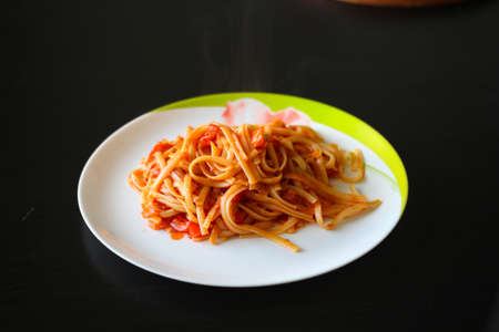 Pasta with vegetable sauce on a white porcelain plate on a black table.