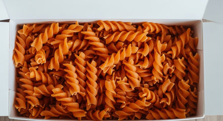 An overhead shot shows a box filled with vibrant orange fusilli pasta. The pasta is tightly packed, showcasing its spiral shape and inviting texture, ready for a delicious meal.