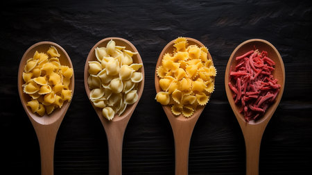 Four wooden spoons with different types and colors pasta, top view, Generative AI
