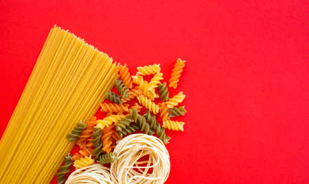 Various uncooked pasta on red background. Flat lay art banner, food concept. Healthy eating