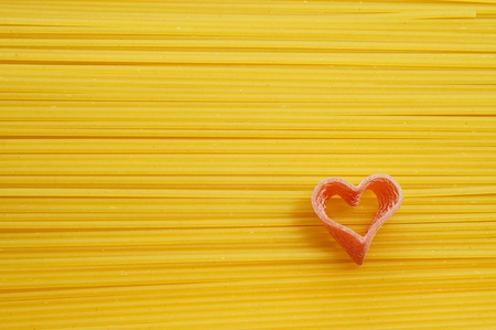 Pasta not cooked on a white plate with a red heart on a dark background with copy space. Pasta love concept.