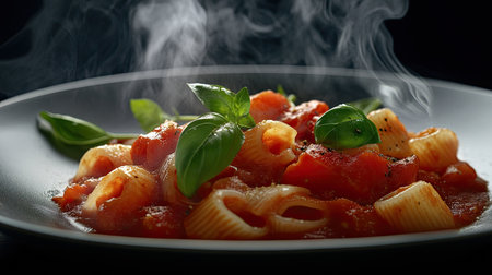Indulge in this irresistible pasta dish featuring rich tomato sauce, fresh basil, and steam rising, showcasing the perfect Italian comfort food experience.