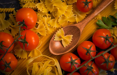 Italian pasta spaghetti and cherry tomato isolated on wooden background
