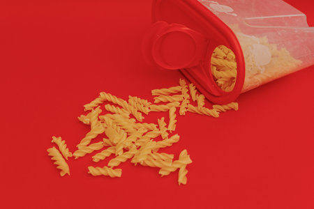 Uncooking pasta with tomatoes and fresh herbs on red background