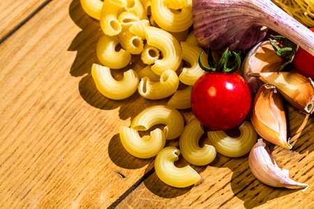 Cooking food background with free space for text. Composition with pasta, tomato, eggs, garlic, bay leaf over the wood background. Ingredients for cooking with copy space. Top view with copy space
