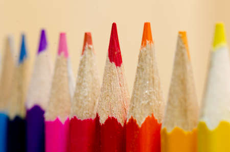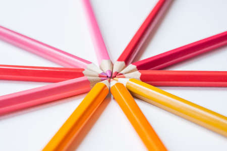Closeup colorful pencil on coral paper background