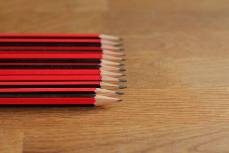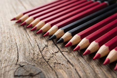 Diagonal line of red colored pencils with two contrasting black pencils in the middle lying on an old textured wooden table with soft focus and shallow depth of field.
