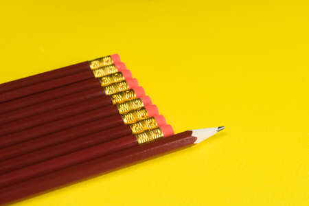 Business concept - lot of same pencils and one different pencil on yellow paper background. Copy paste.
