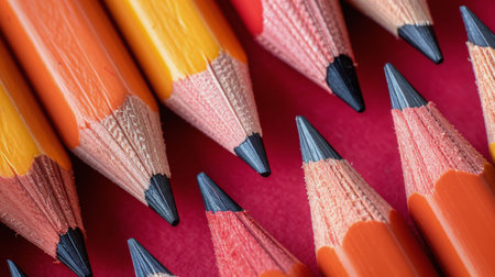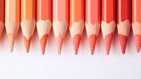 A collection of colored pencils arranged in a gradient pattern showcases shades of red and orange. The soft tips and minimalist design highlight the beauty of simple art supplies.