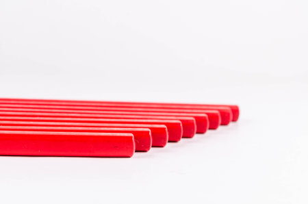 Red crayons organized in a row over red background, above view