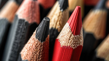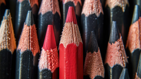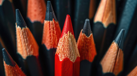 Close-up of a red pencil in contrast with multiple black pencils, illustrating initiative, independence, and creative thinking in business success