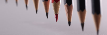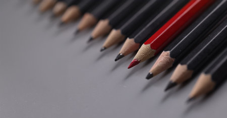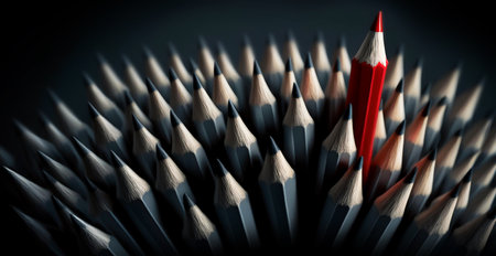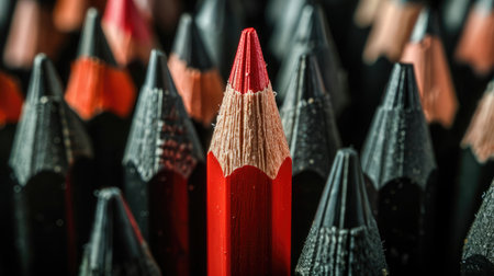 Single red pencil standing out from a group of black pencils, highlighting uniqueness, initiative, and leadership qualities in business strategy