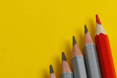 red pencil and gray pencils on a yellow paper background. Leader concept, different, unique.Text